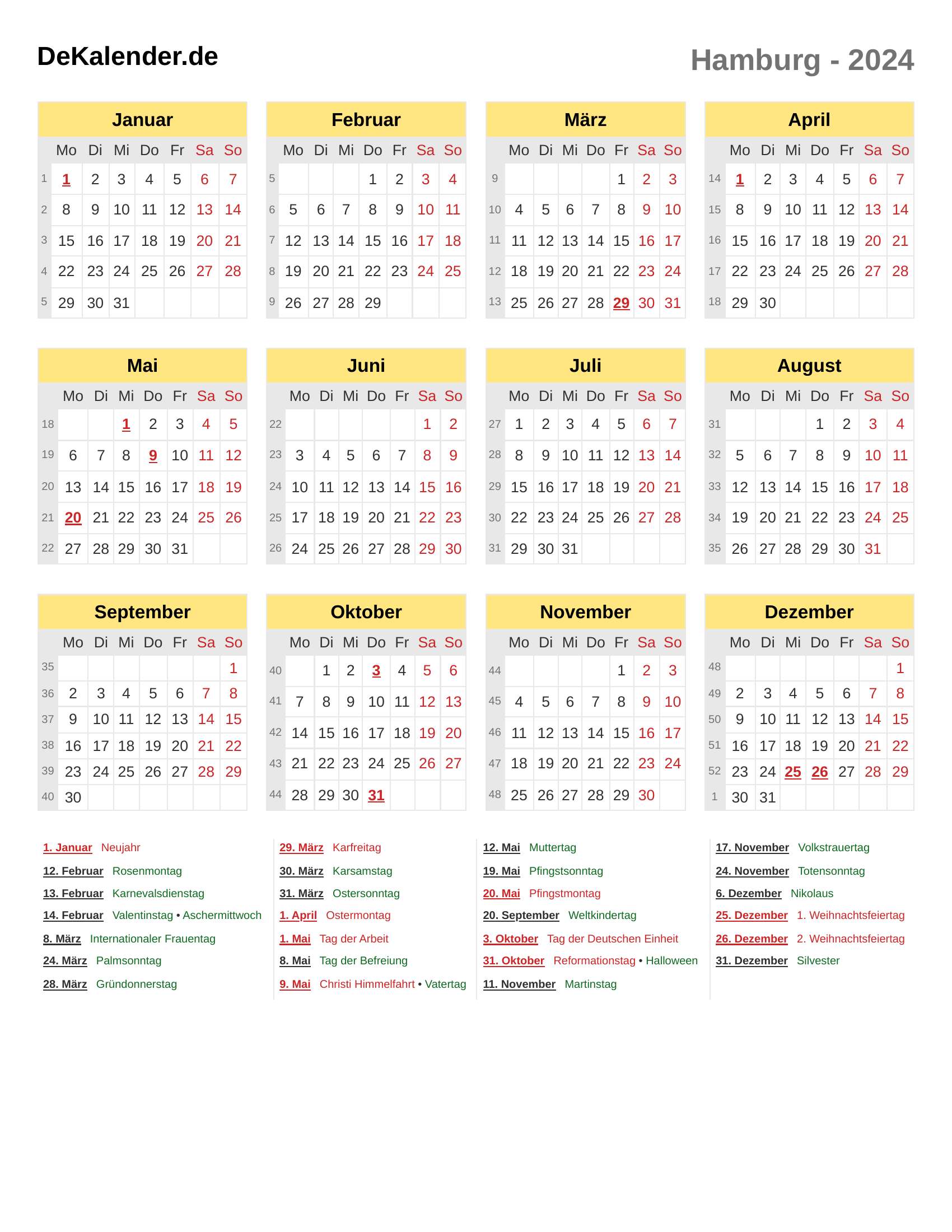 Feiertage und Gedenktage im 2024 (Hamburg)