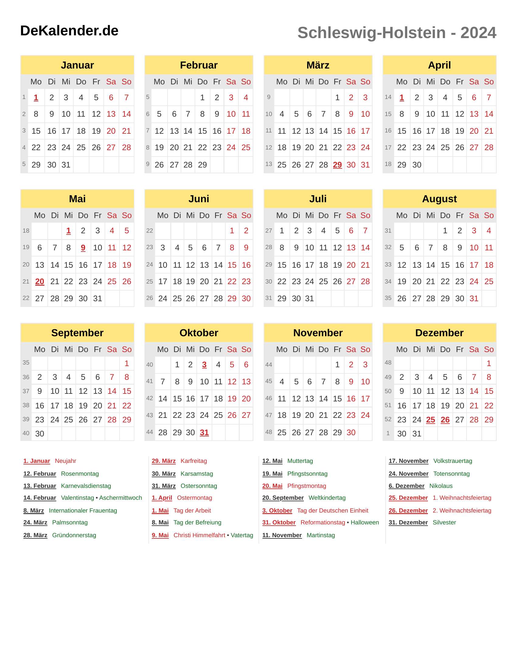 Feiertage und Gedenktage im 2024 (SH)