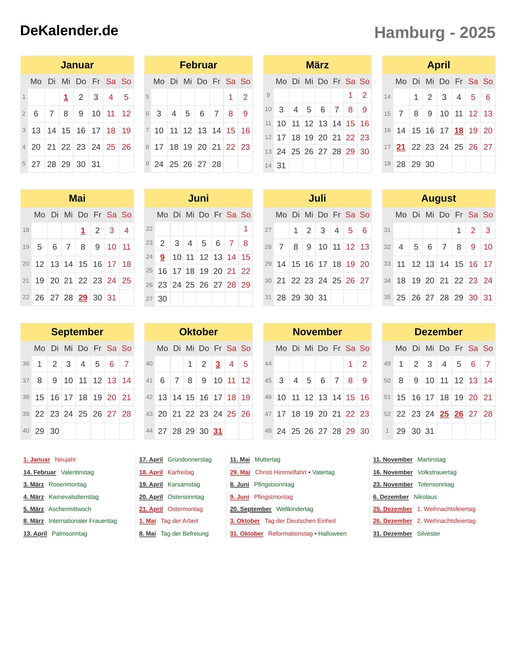 Feiertage und Gedenktage im 2025 (Hamburg)