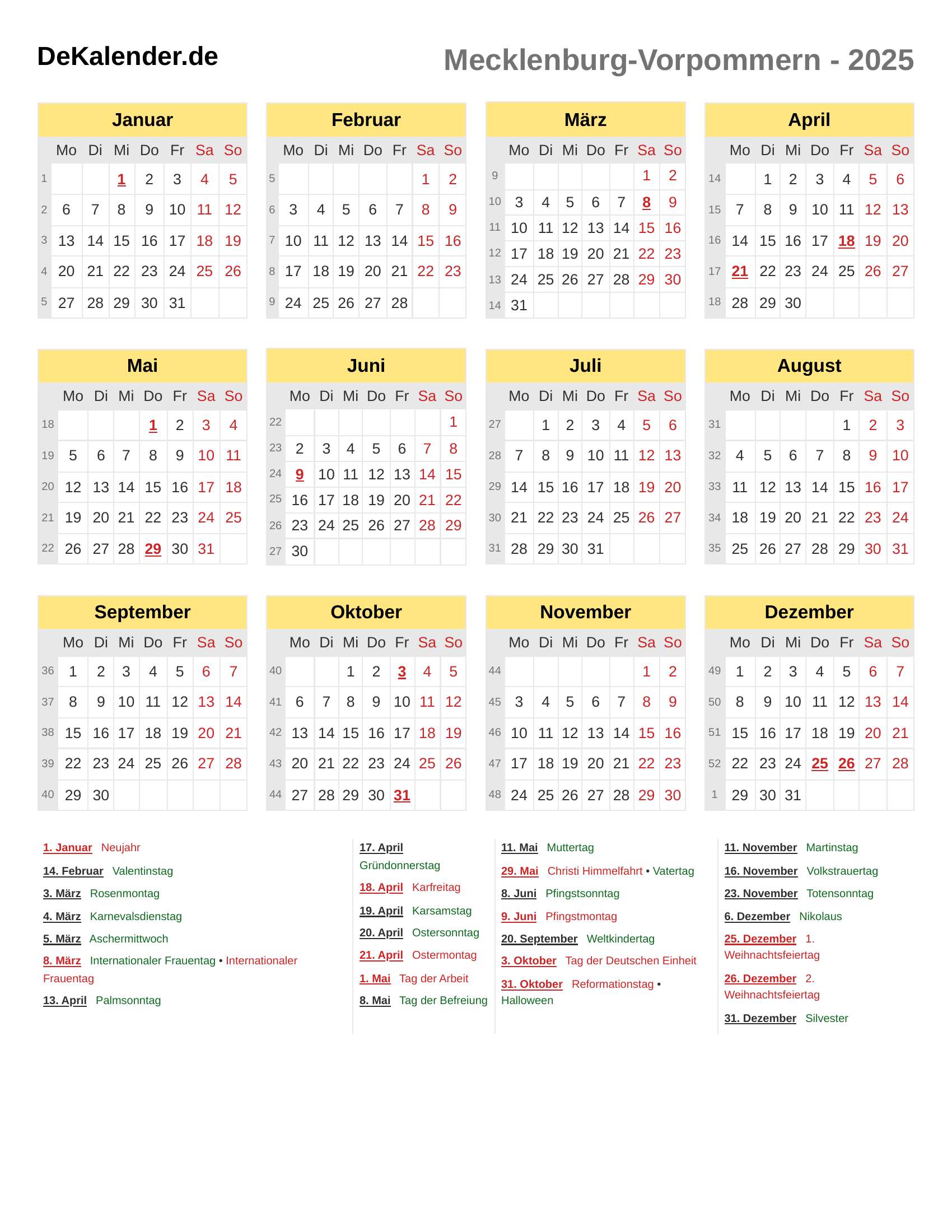 Feiertage und Gedenktage im 2025 (Meck-Pom)
