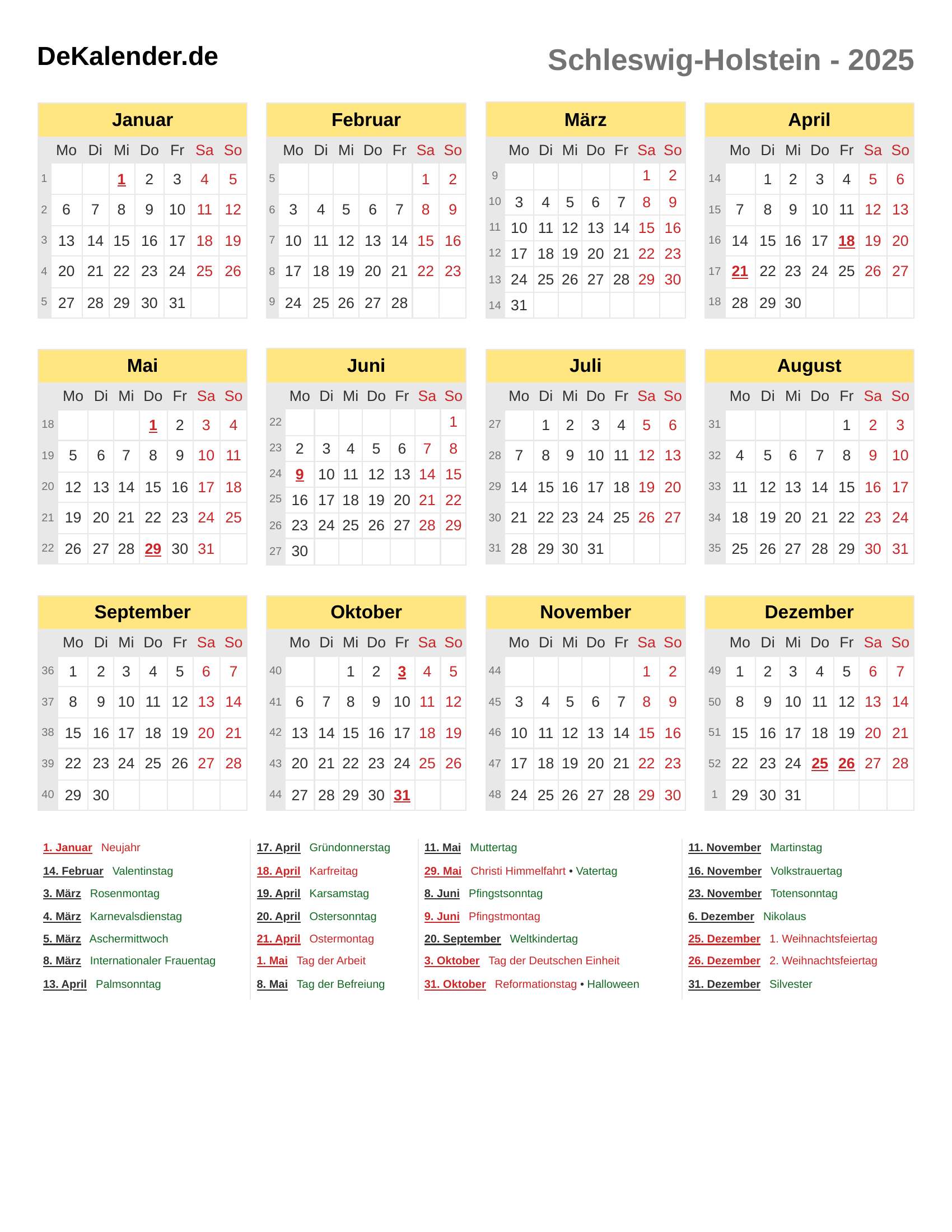 Feiertage und Gedenktage im 2025 (SH)