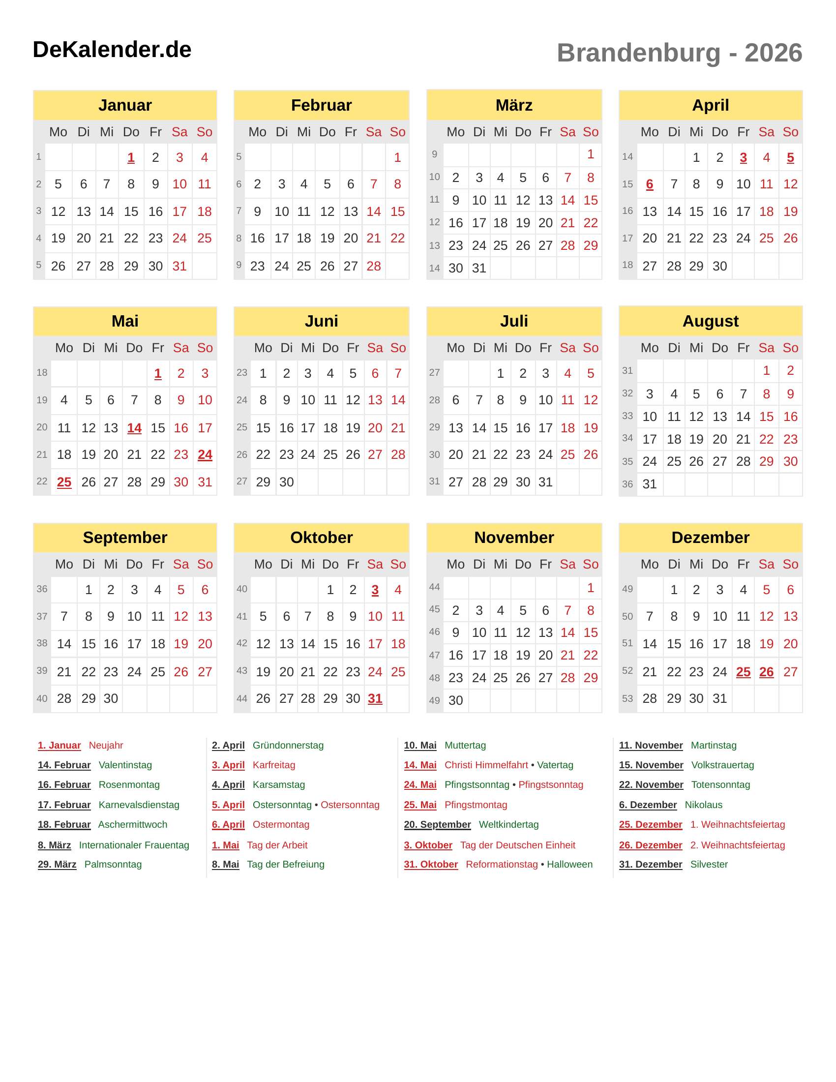 Kalender 2026 - Brandenburg