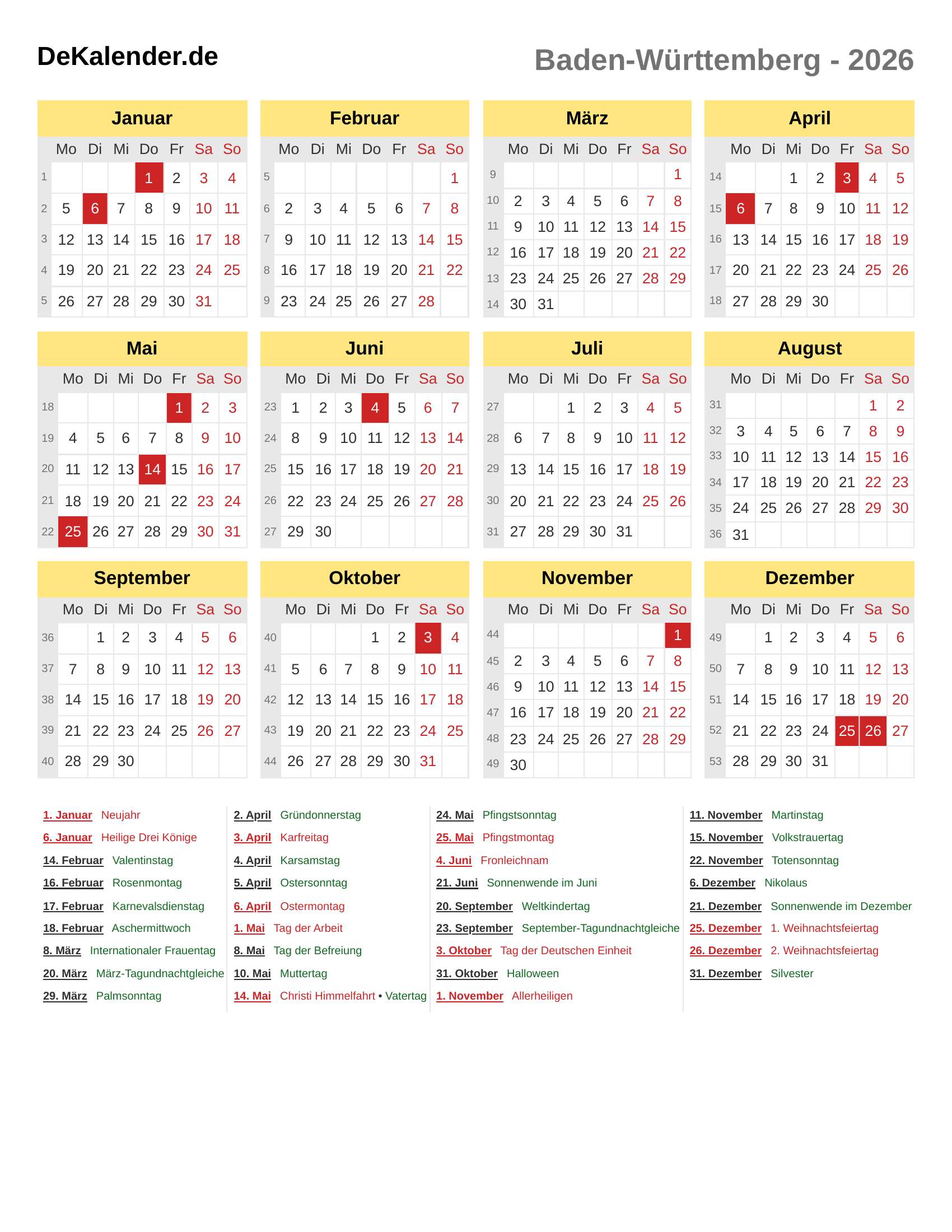 Kalender 2026 - Baden-Württemberg