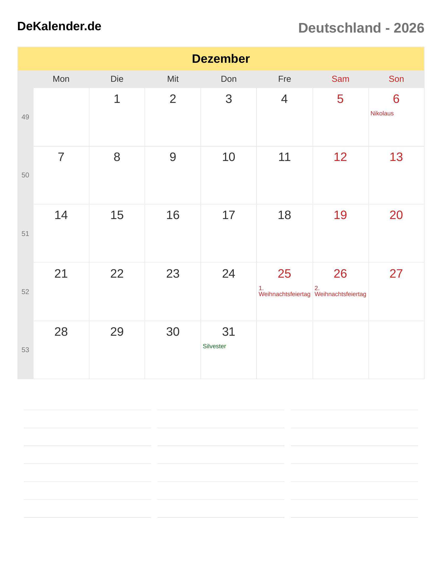 Kalender Dezember 2026 – Deutschland