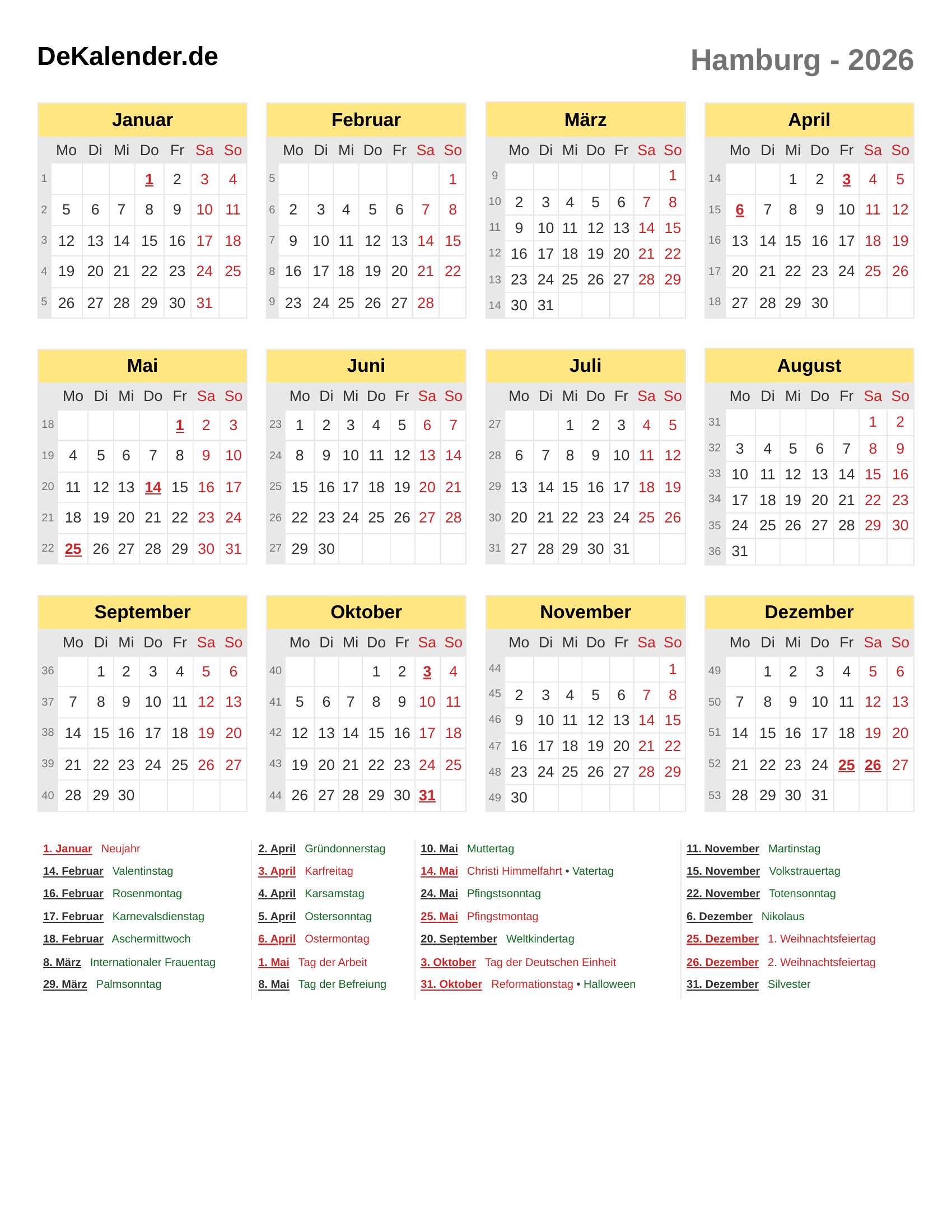 Feiertage und Gedenktage im 2026 (Hamburg)