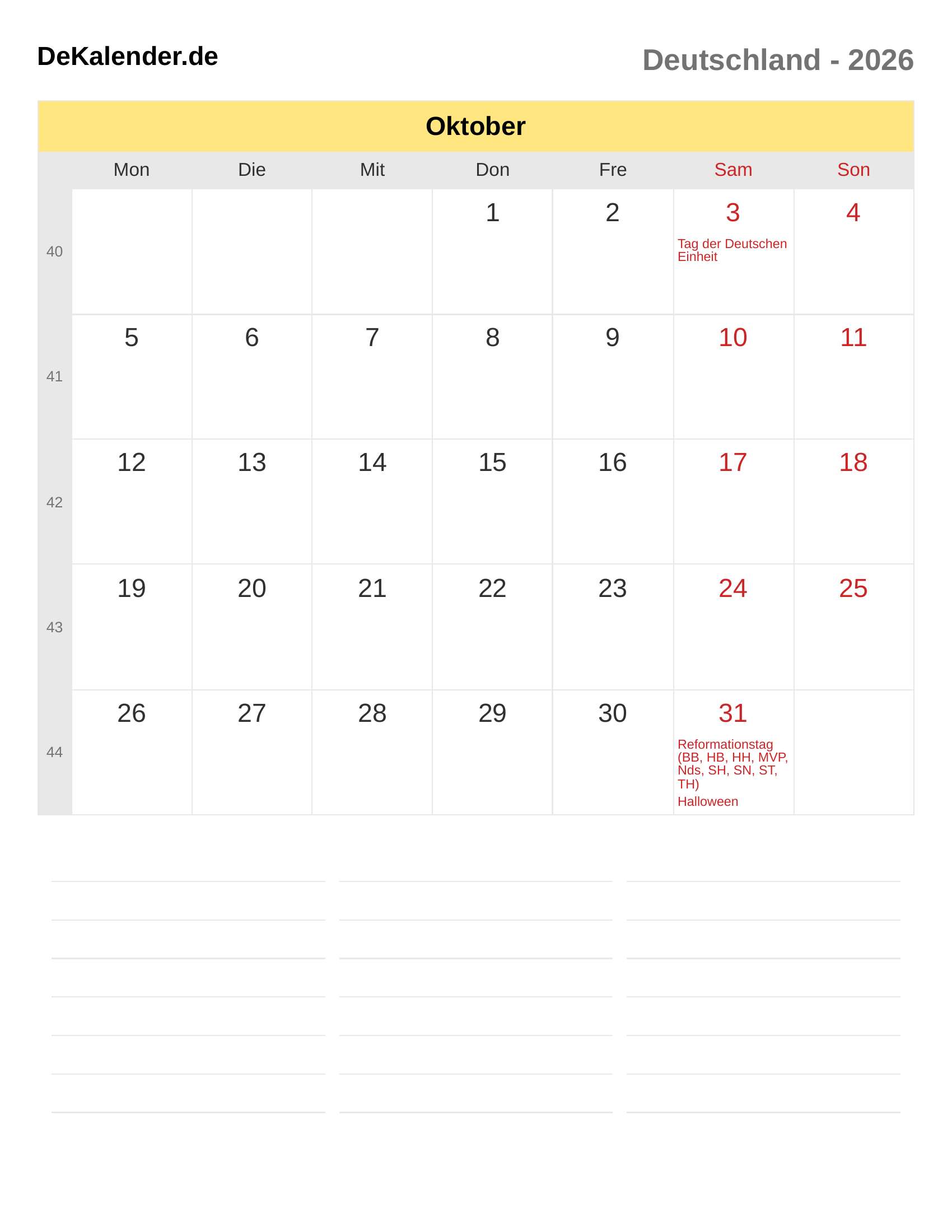 Kalender Oktober 2026 – Deutschland