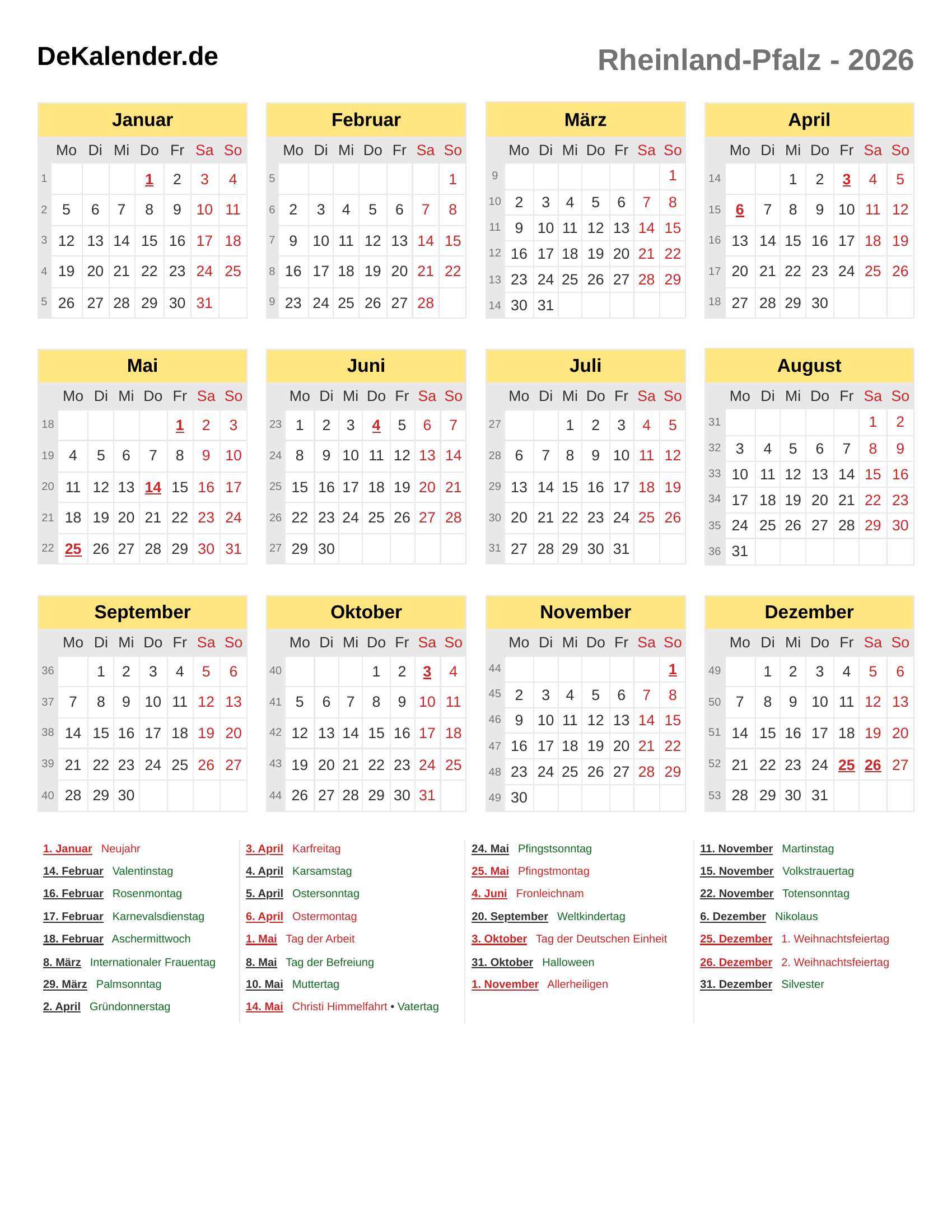Kalender 2026 - Rheinland-Pfalz