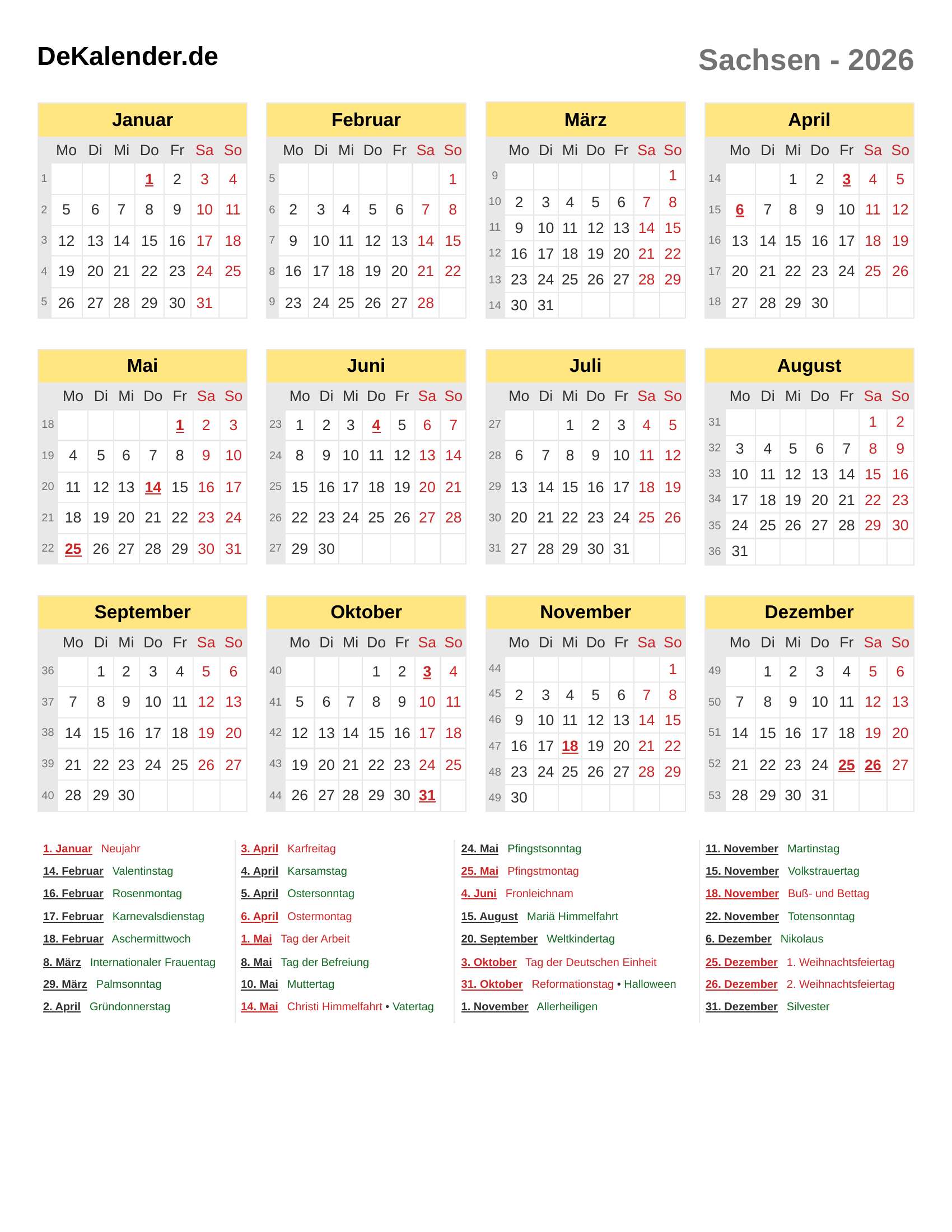 Feiertage und Gedenktage im 2026 (Sachsen)