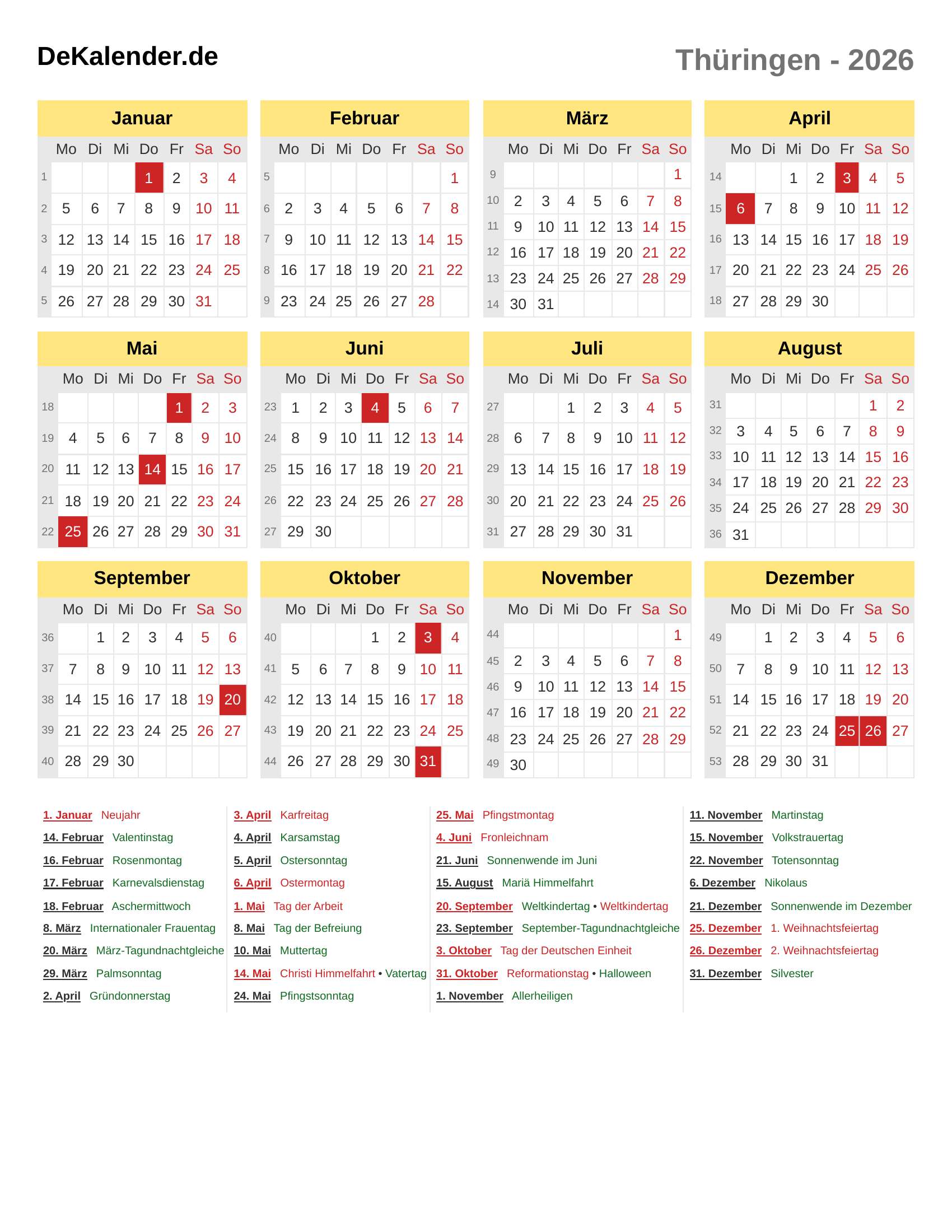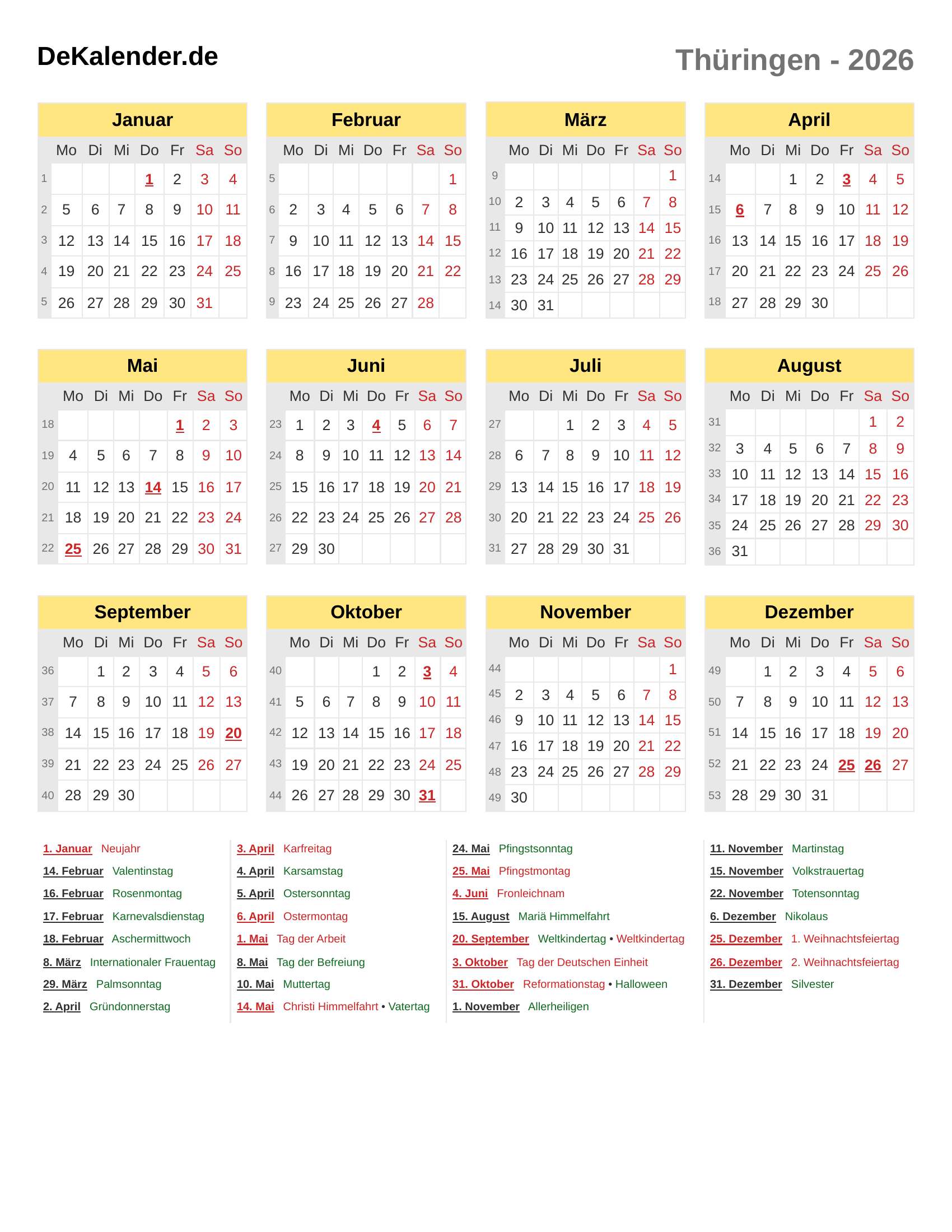 Feiertage und Gedenktage im 2026 (Thüringen)