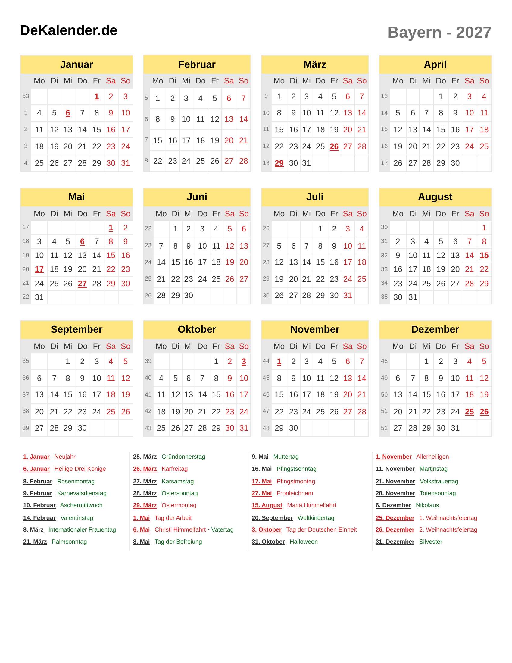 Feiertage und Gedenktage im 2027 (Bayern)