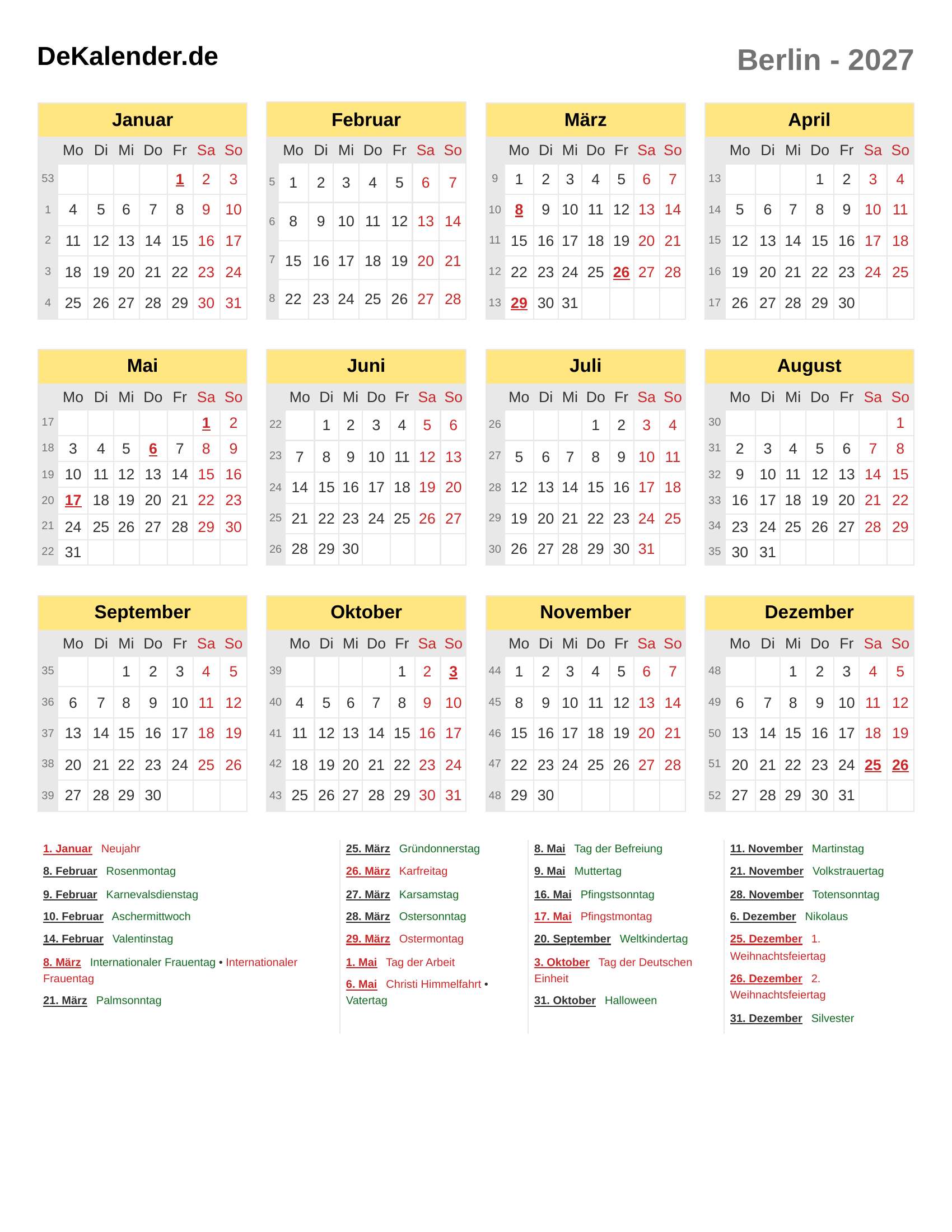 Feiertage und Gedenktage im 2027 (Berlin)