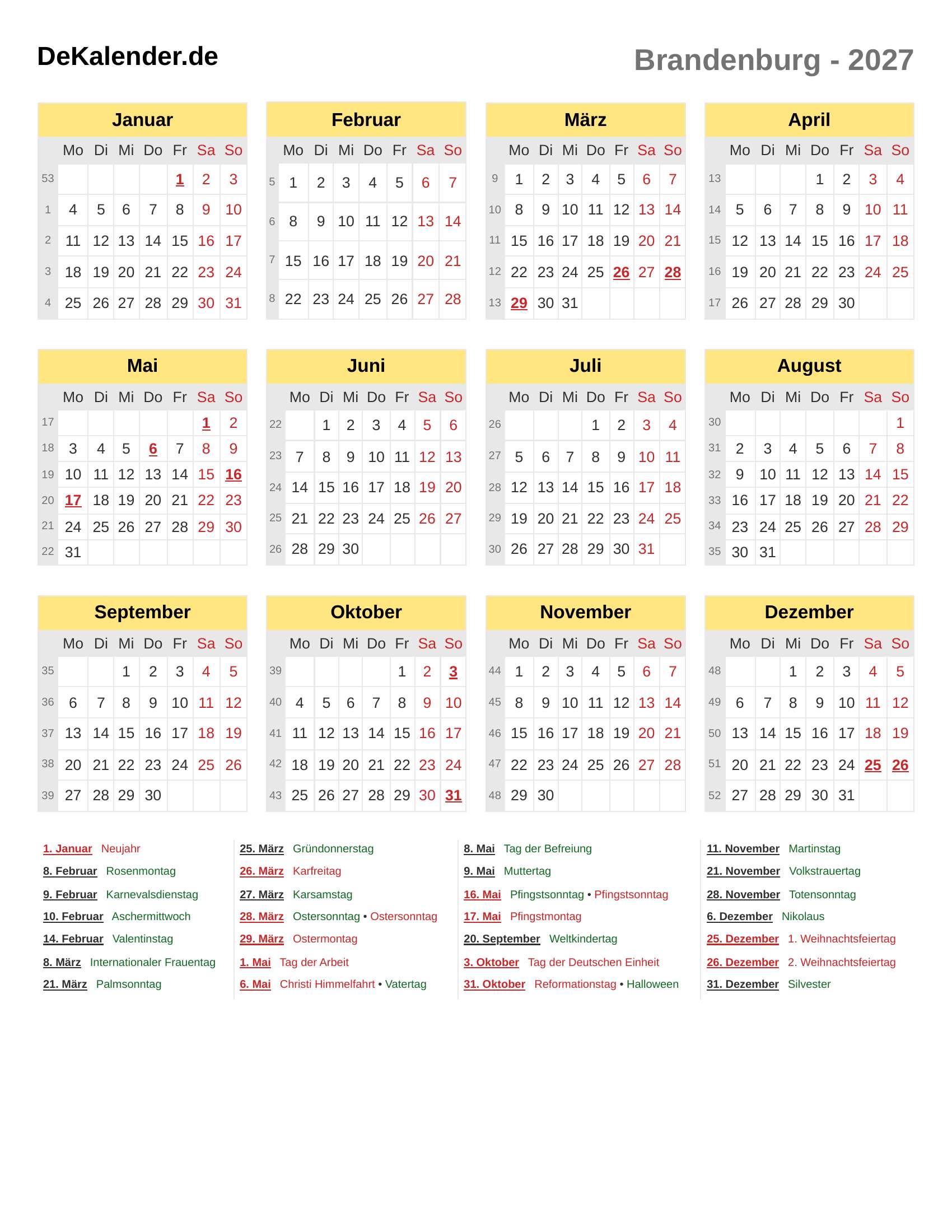 Feiertage und Gedenktage im 2027 (Brandenburg)