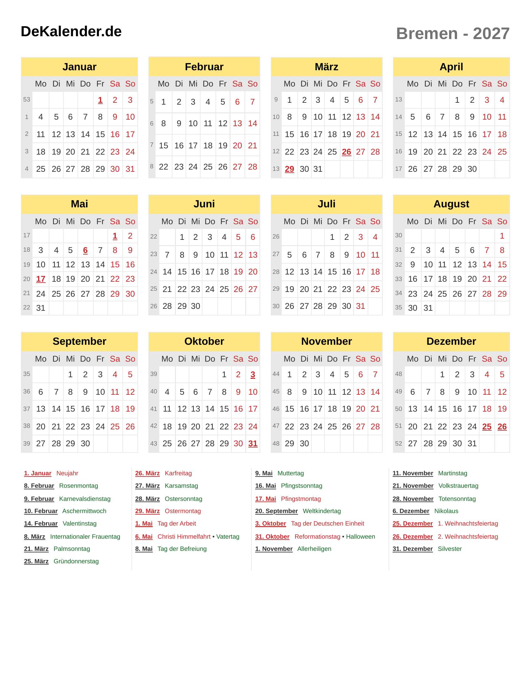 Feiertage und Gedenktage im 2027 (Bremen)