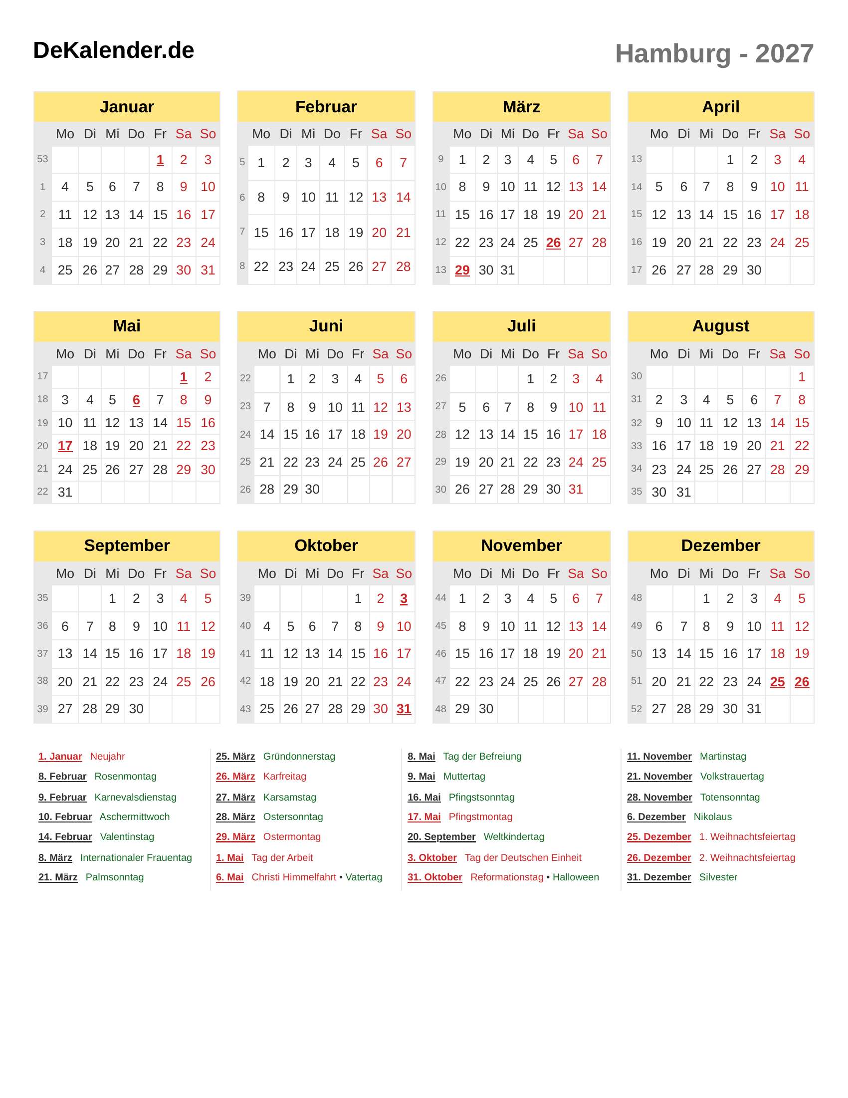 Feiertage und Gedenktage im 2027 (Hamburg)