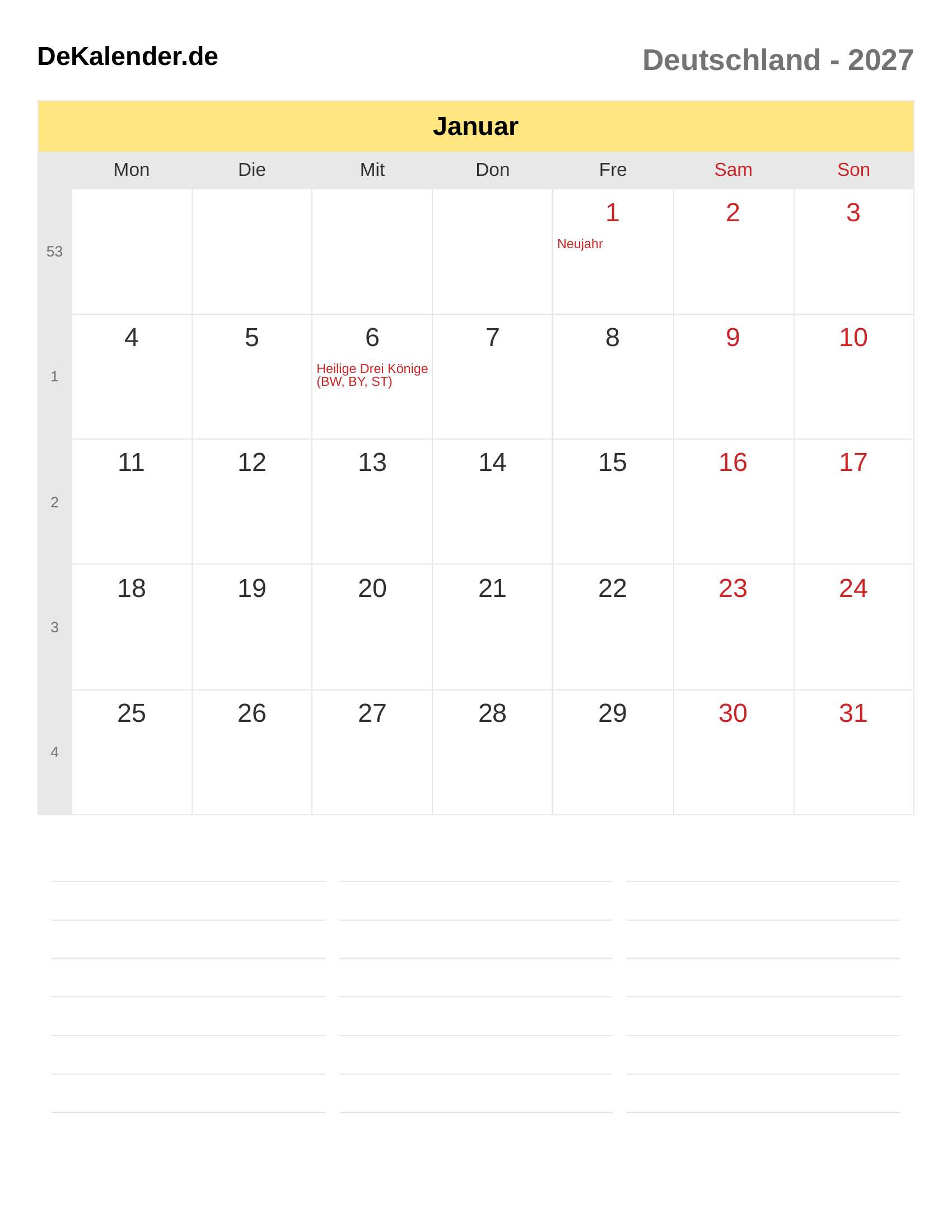 Kalender Januar 2027 – Deutschland
