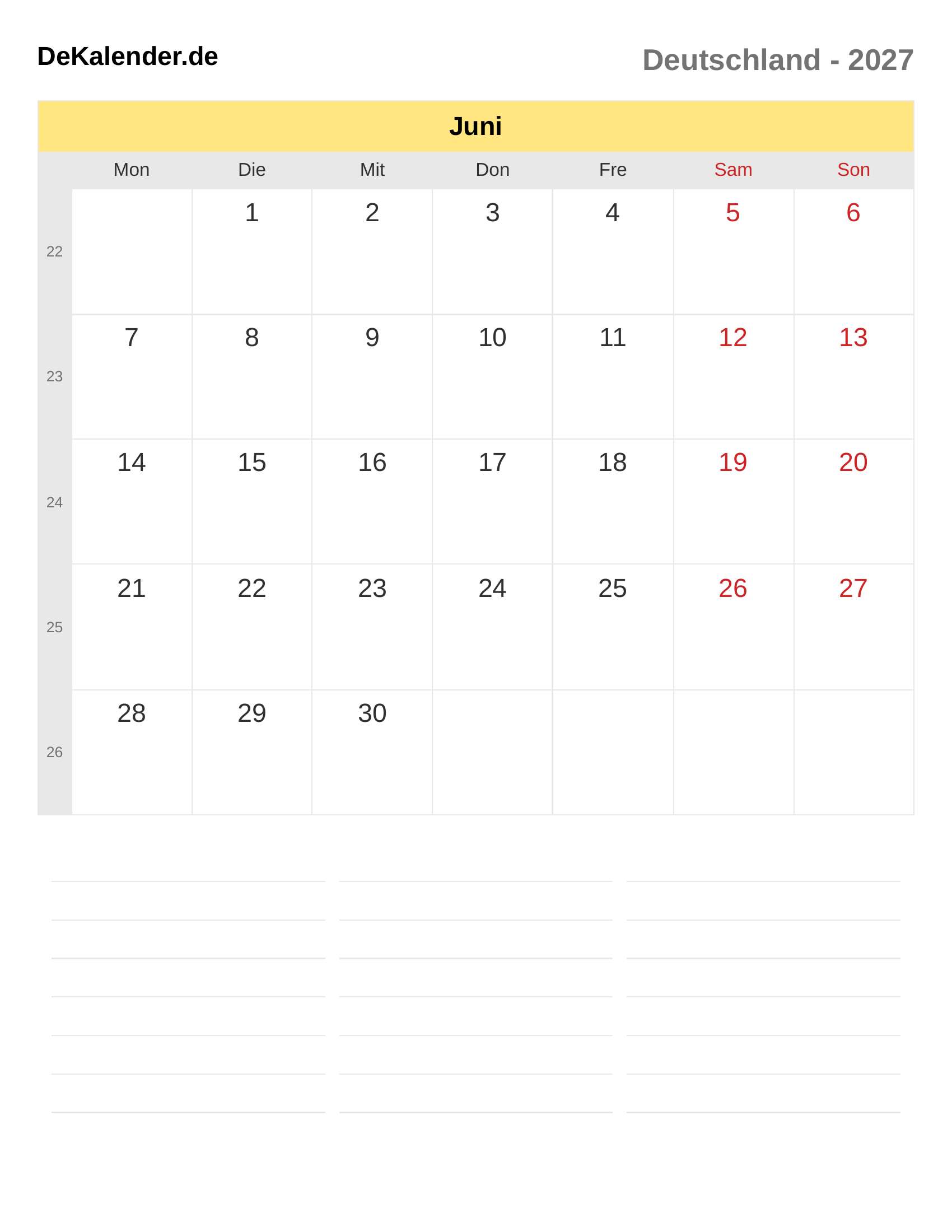 Laden Sie den Kalender Juni 2027 herunter