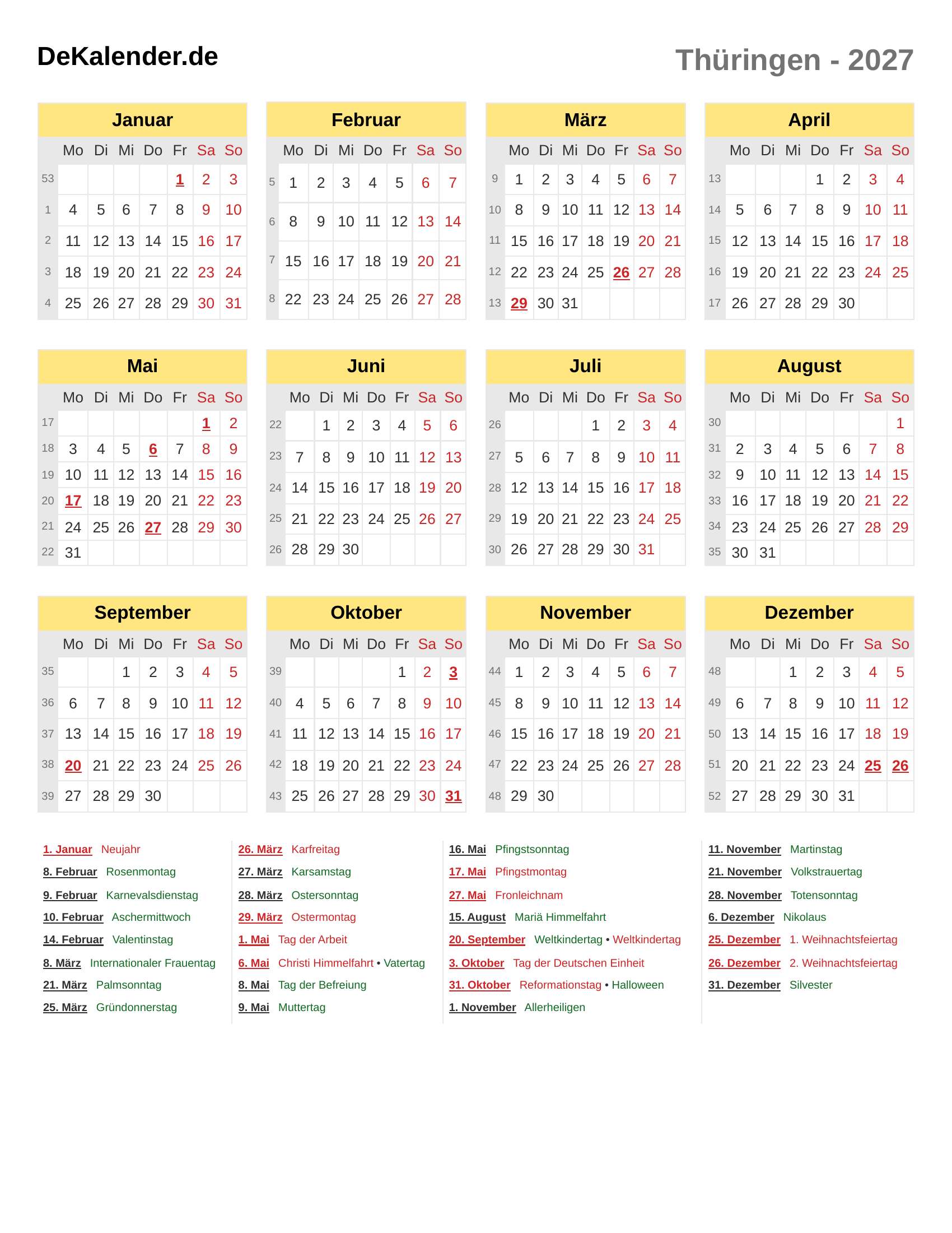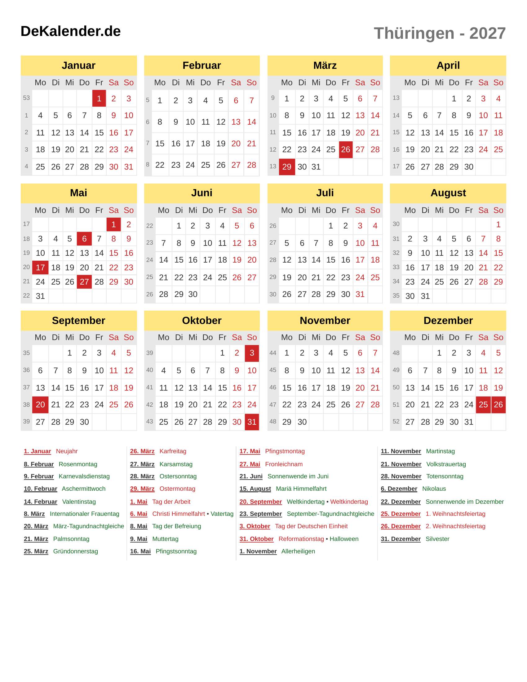 Feiertage und Gedenktage im 2027 (Thüringen)