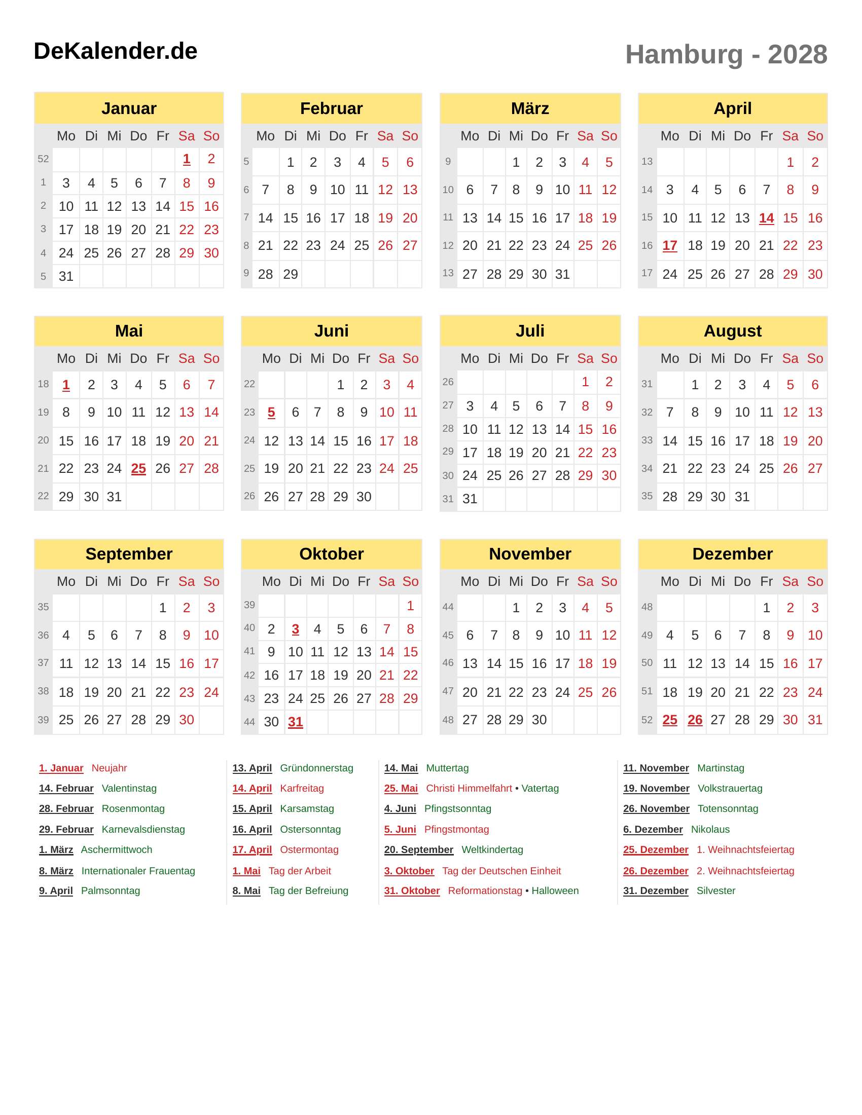 Feiertage und Gedenktage im 2028 (Hamburg)