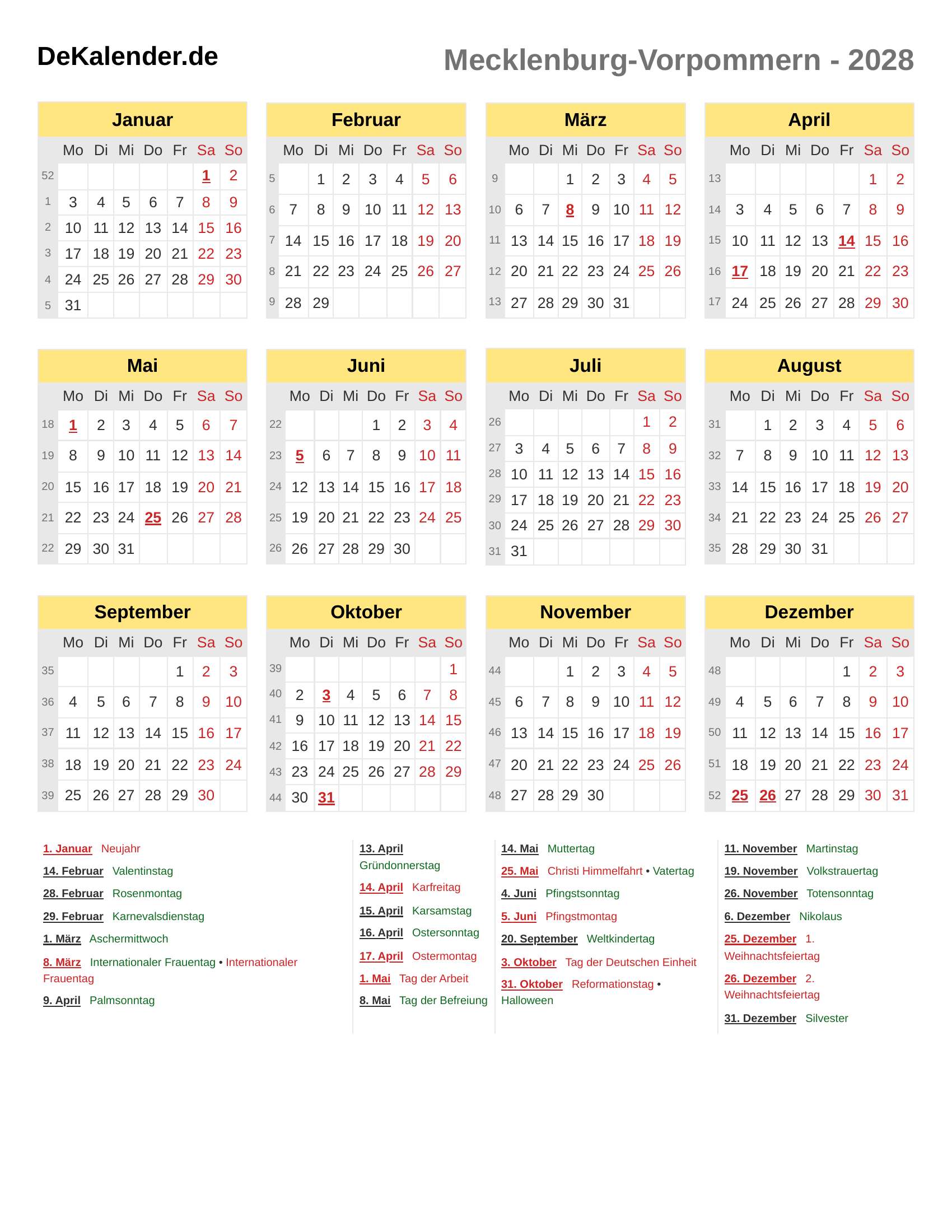 Kalender 2028 - Mecklenburg-Vorpommern