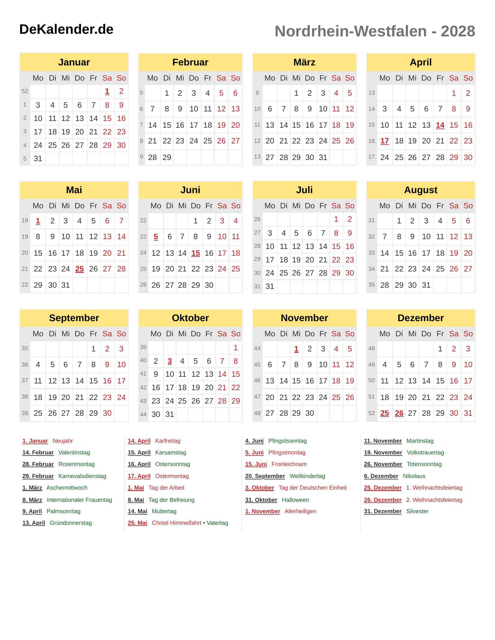 Kalender 2028 - Nordrhein-Westfalen