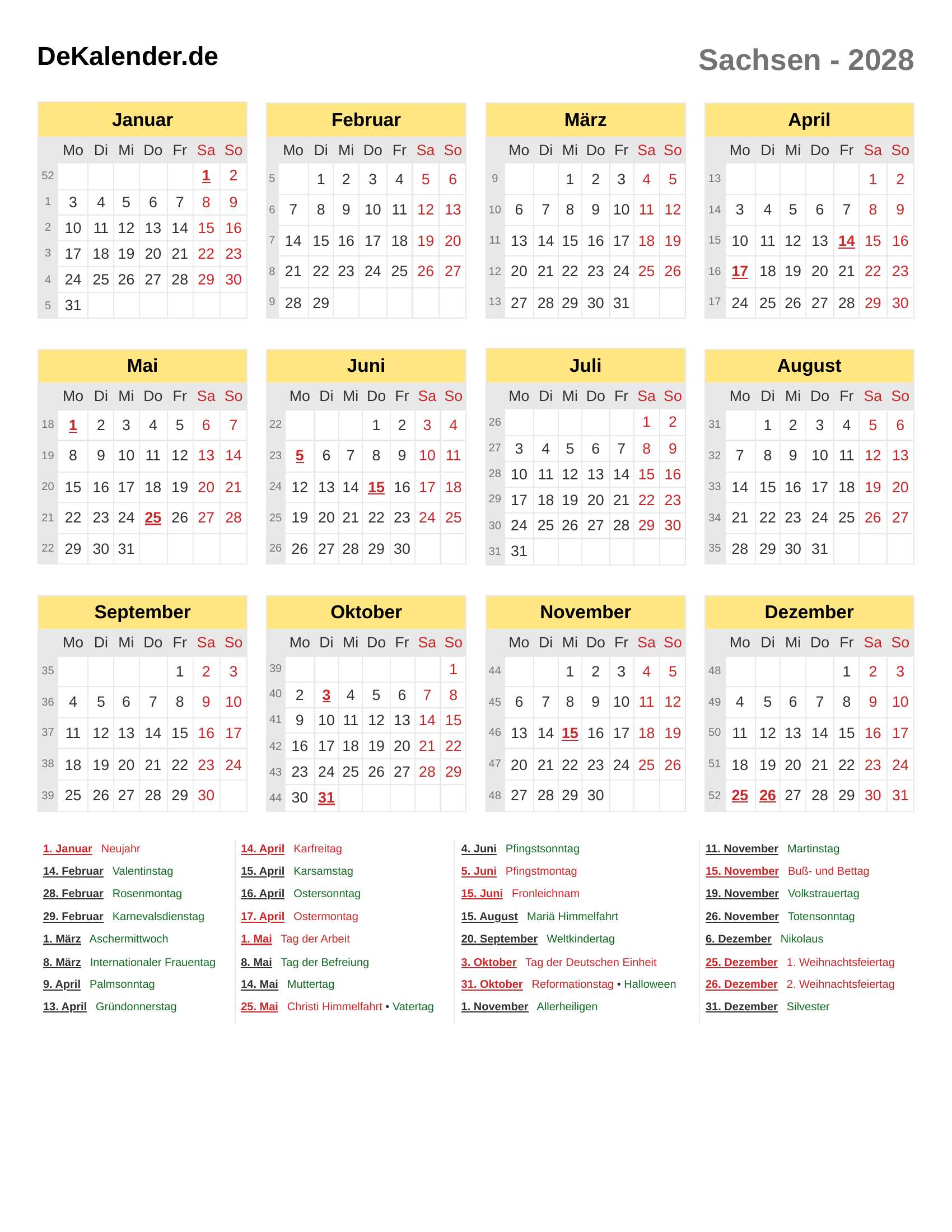 Kalender 2028 - Sachsen