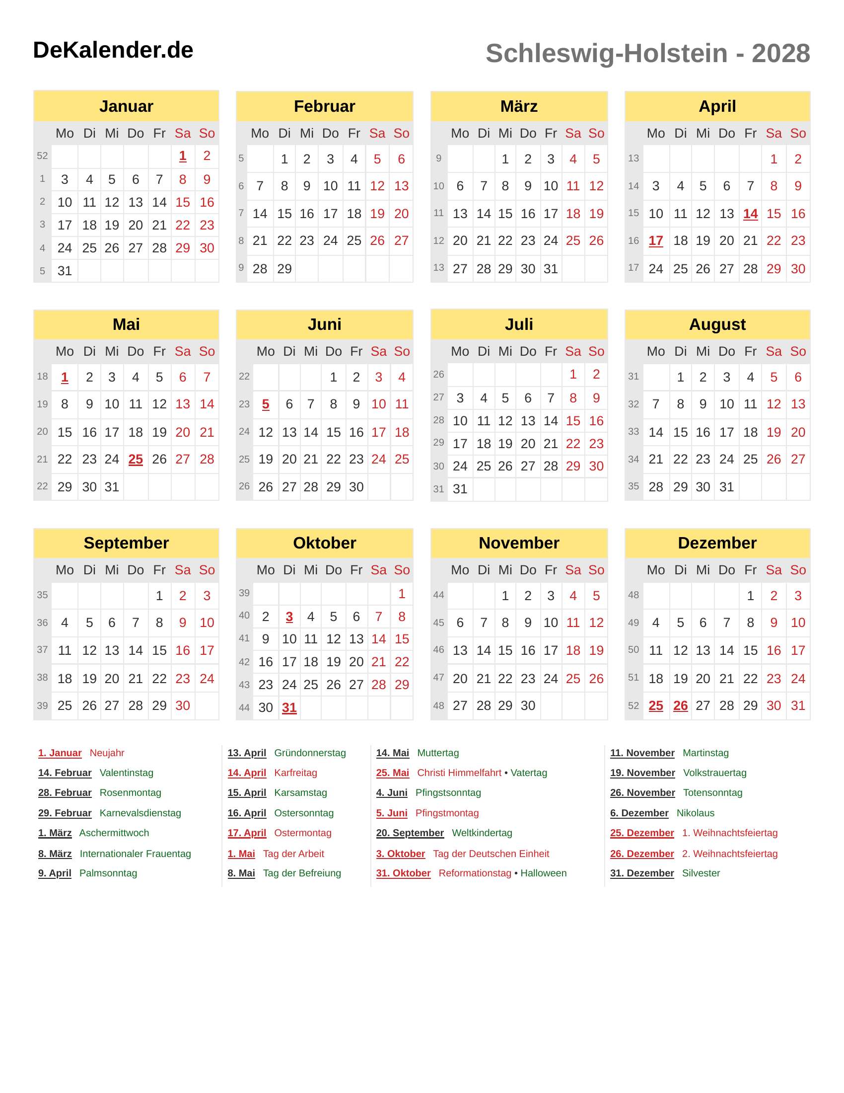 Kalender 2028 - Schleswig-Holstein