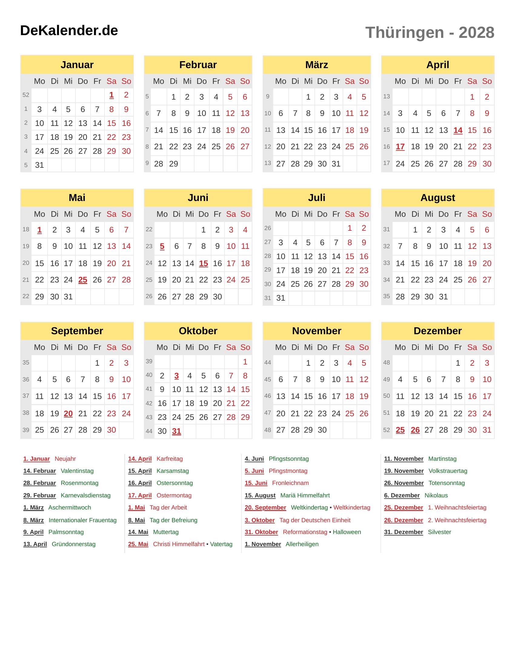 Feiertage und Gedenktage im 2028 (Thüringen)