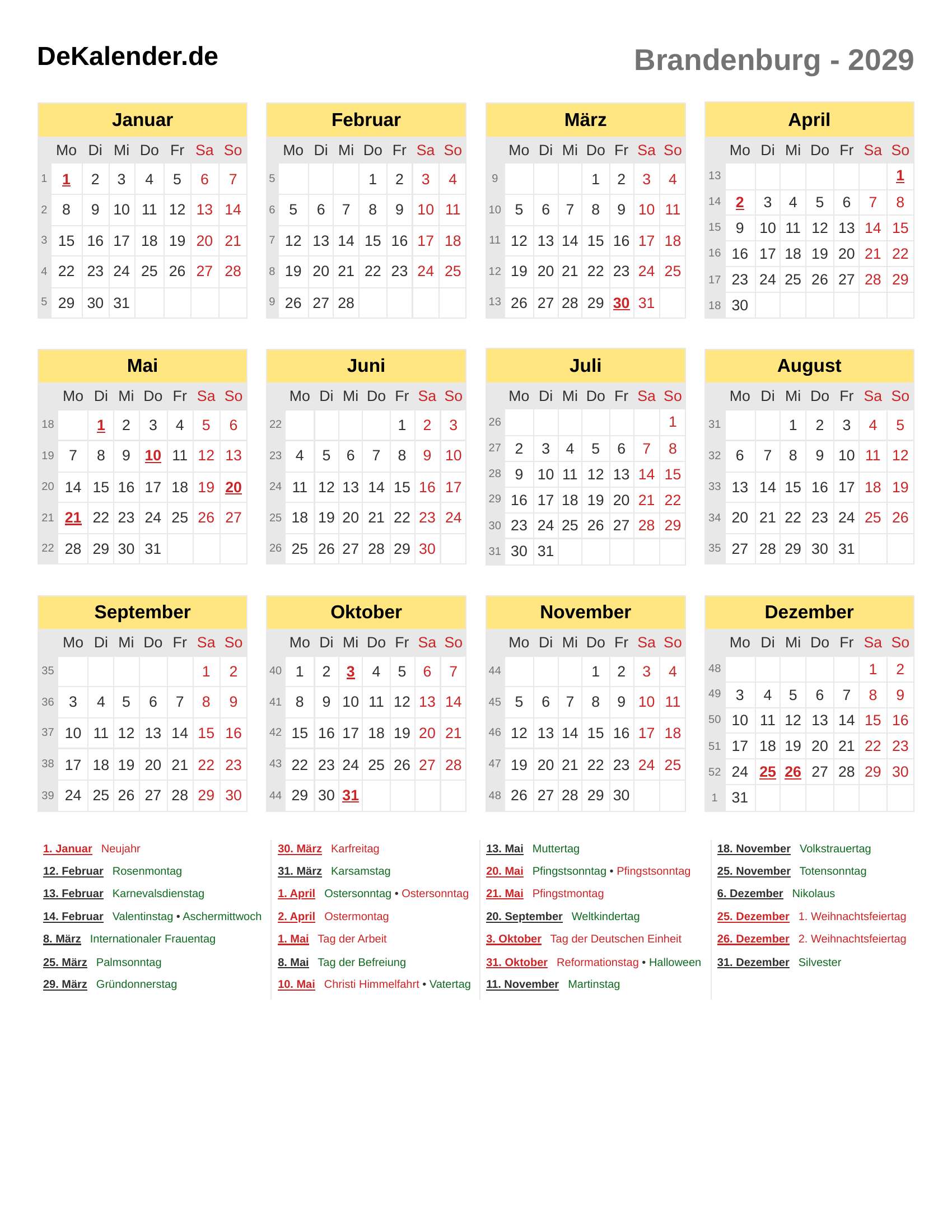 Feiertage und Gedenktage im 2029 (Brandenburg)