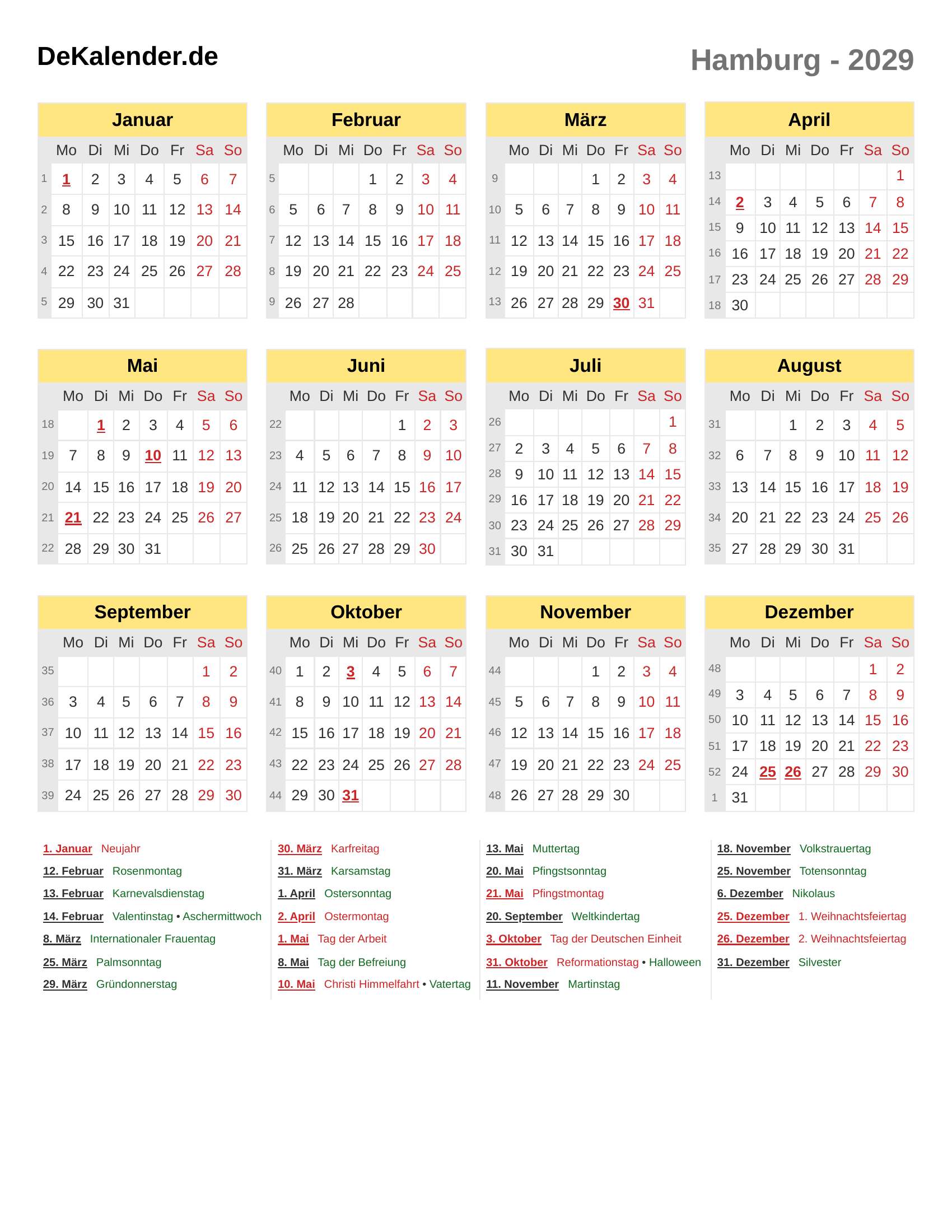 Feiertage und Gedenktage im 2029 (Hamburg)