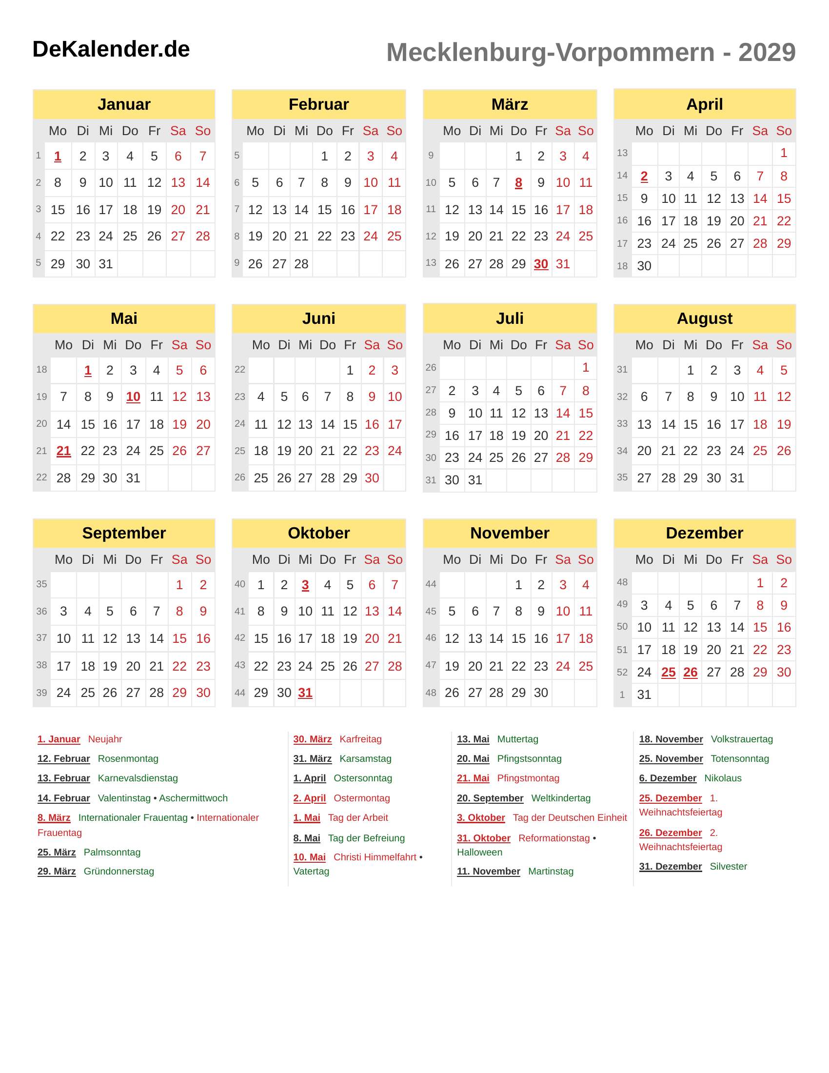 Feiertage und Gedenktage im 2029 (Meck-Pom)