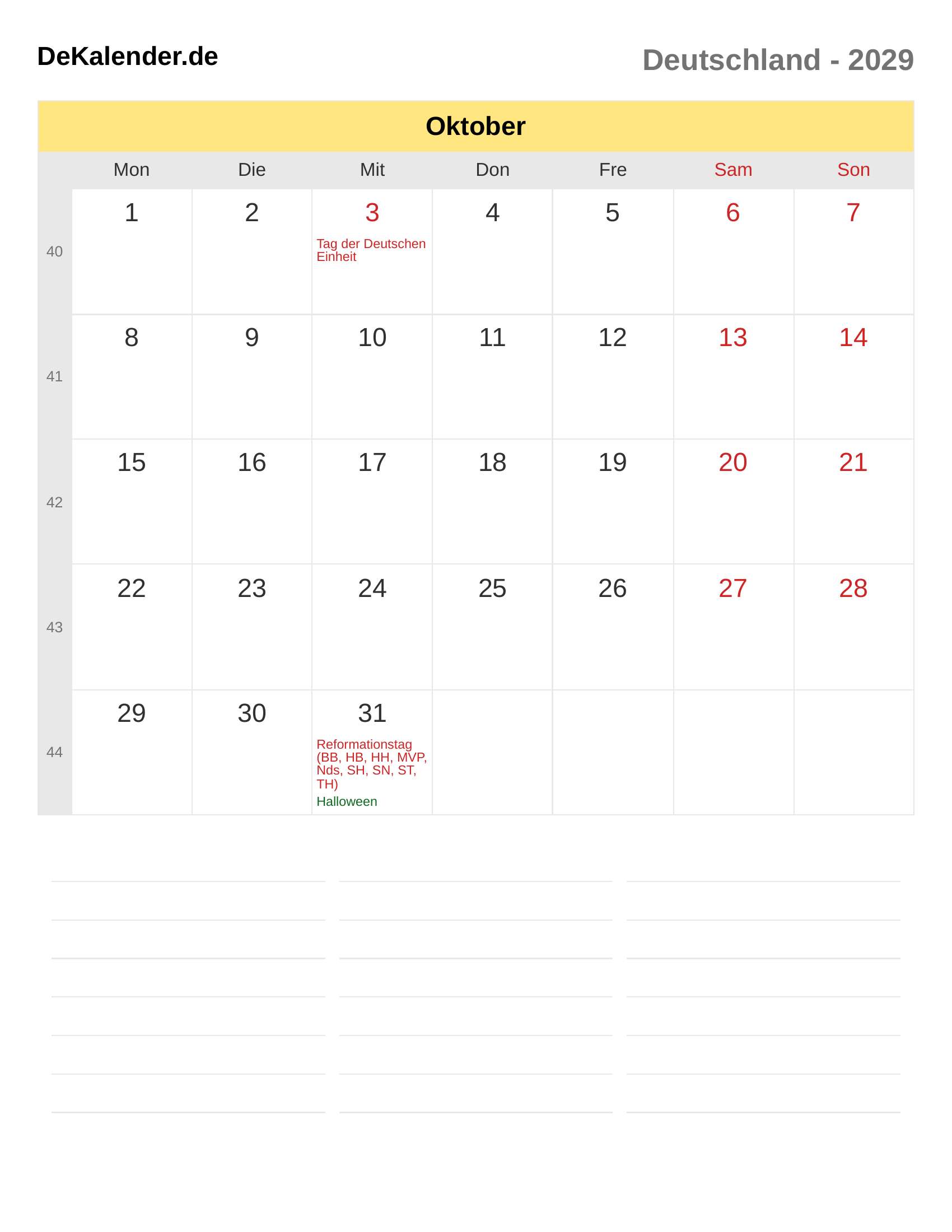 Kalender Oktober 2029 – Deutschland