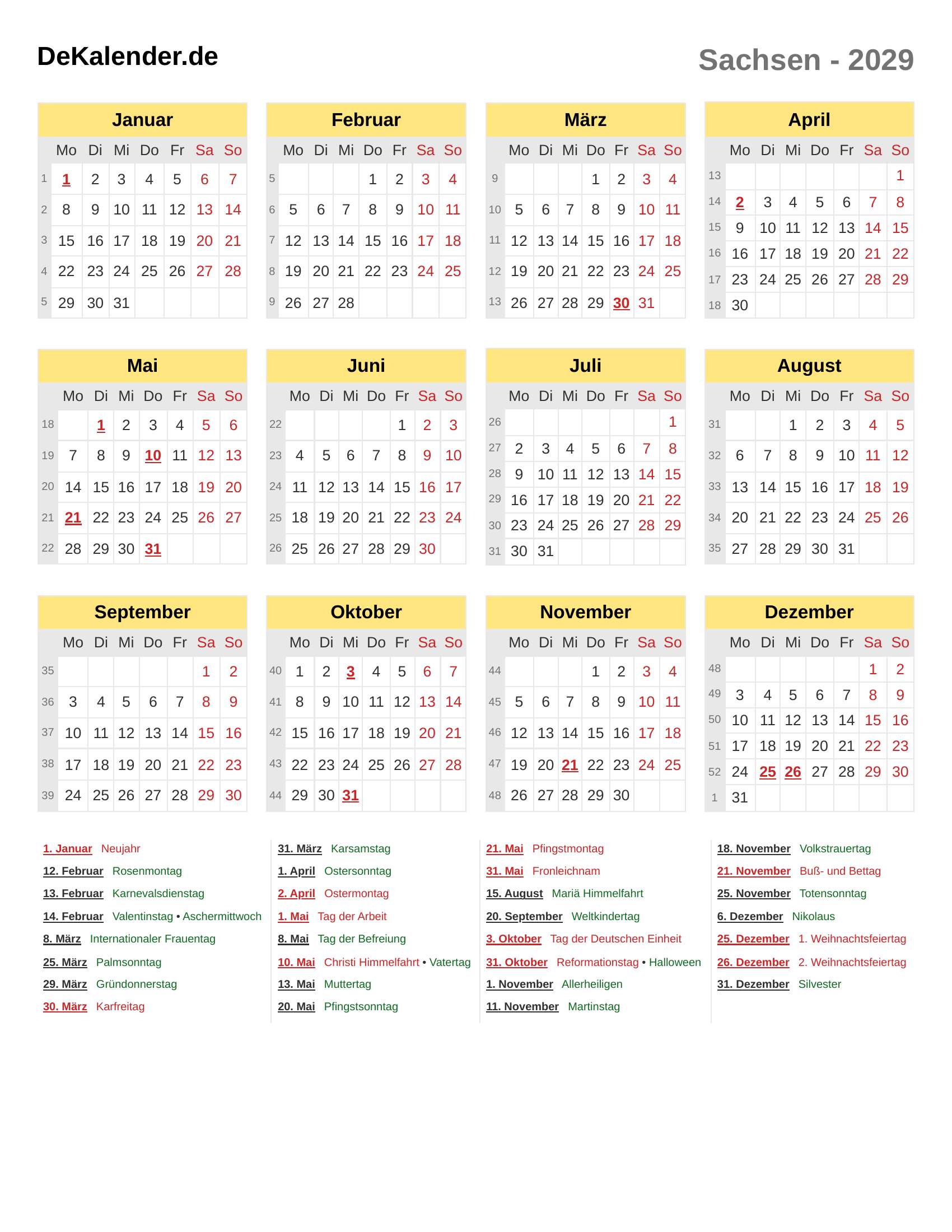 Feiertage und Gedenktage im 2029 (Sachsen)